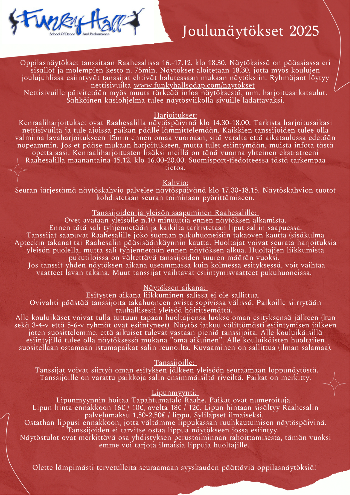 Syyskauden päättävät oppilasnäytökset tanssitaan Raahesalissa ti ja ke 16.-17.12.2025. Liput Raahesalin lipunmyynnistä.